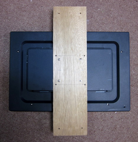 To mount the new light fixture to the ceiling, a plywood bracket was constructed. This particular monitor has a VESA mount which uses four M4 machine screws 75 mm apart. |
